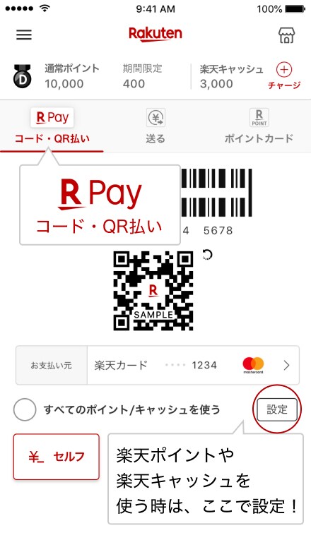 楽天ペイでは、クレジット支払い以外に、楽天キャッシュや楽天ポイントでの支払いも可能です。