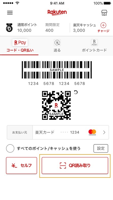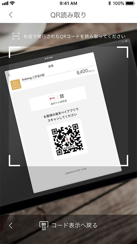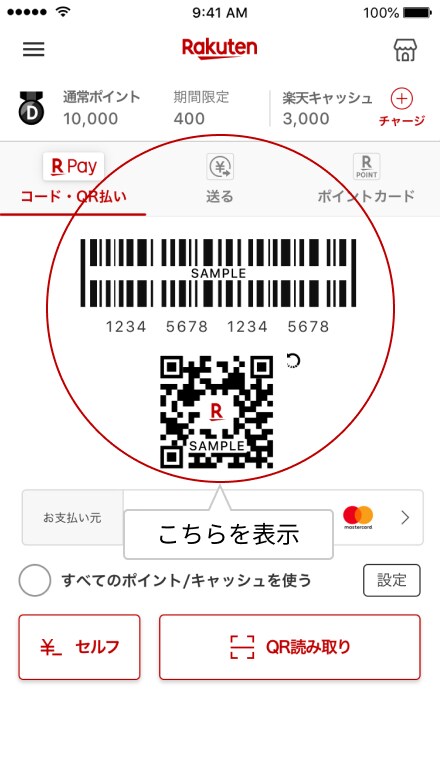 コード払いは、楽天ペイアプリに表示されたバーコードを読み取ってもらうだけです。