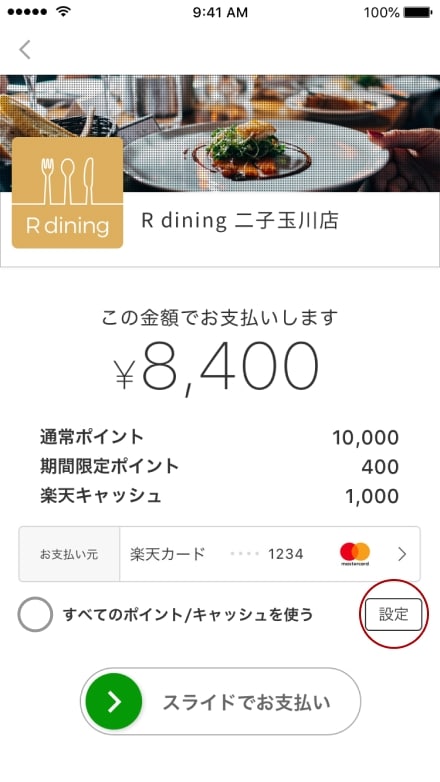 確認画面でスライド 楽天ポイントや楽天キャッシュを使う時は、ここで設定 |